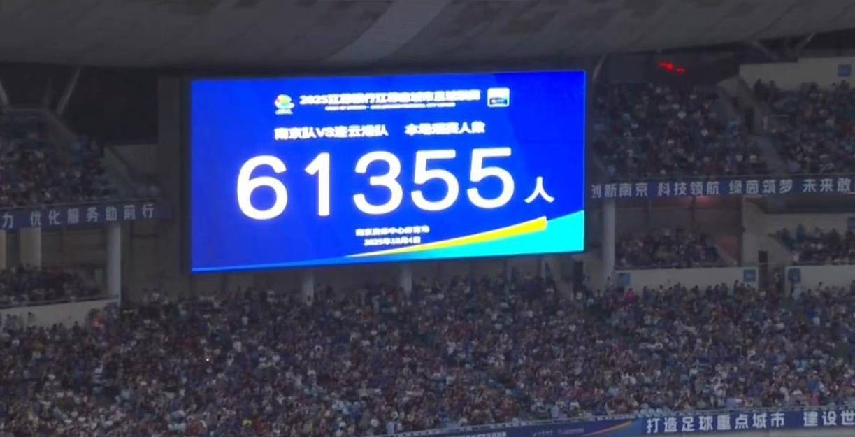 这场比赛的观众人数达到61355人,创下苏超联赛新纪录。 南京奥体中心此前已连续四次刷新观赛人数,从60396人到61106人,这次再创新高。 正值国庆中秋假期,许多外地球迷专程赶来,看台上座无虚席。 比赛开始前,全场齐唱国歌,气氛庄重热烈。 南京市建邺区银杏里文化艺术街区还设置了第二现场观赛区,未能购票的球迷聚集于此,通过大屏幕为球队加油。 整个城市都沉浸在足球氛围中。