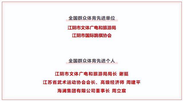 11月10日,国家体育总局举行表彰大会。在2021-2024年度全国群众体育先进评选中,江阴多家单位和个人受到表彰。