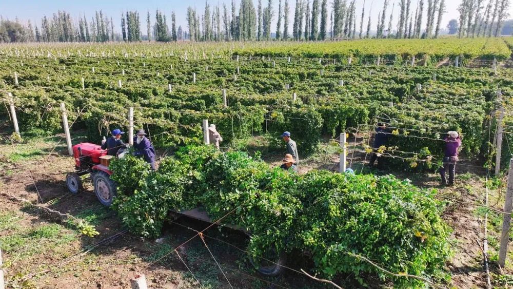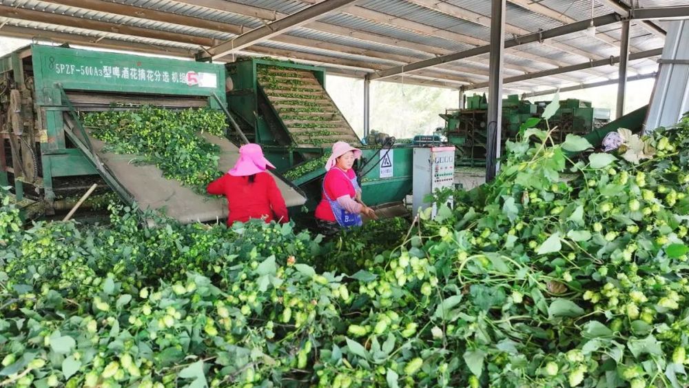 在142团的啤酒花田,空气中弥漫着浓郁的啤酒花香。由于种植方式特殊,种植户采用手工方式摘秧、装运。新鲜啤酒花经分拣、烘干、压缩等工序,加工成便于储运的制品。
