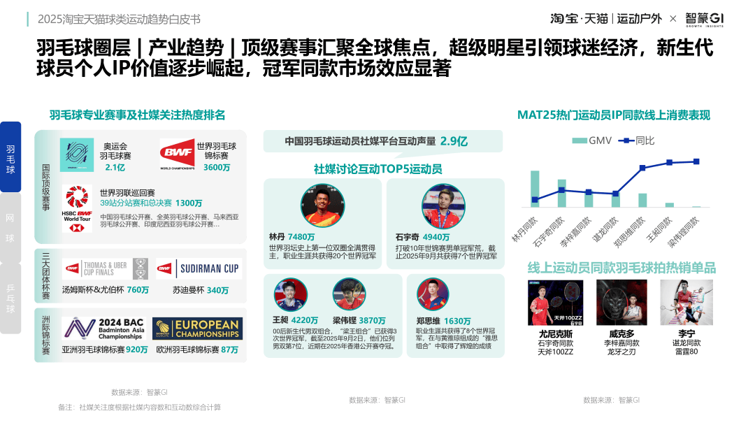 除了“村超”等足球运动,羽毛球、网球、乒乓球等“小球运动”也凭借庞大用户基数和鲜明圈层文化快速发展。羽毛球赛事体系丰富,吸引了全球目光,中国羽毛球运动员在社媒平台声量高达2.9亿,热门运动员IP同款产品线上消费表现亮眼,形成从赛事到明星再到商业的完整生态链。2025年羽毛球市场线%,礼赠场景推动礼盒装产品激增,羽毛球鞋包也从功能升级为时尚装备。